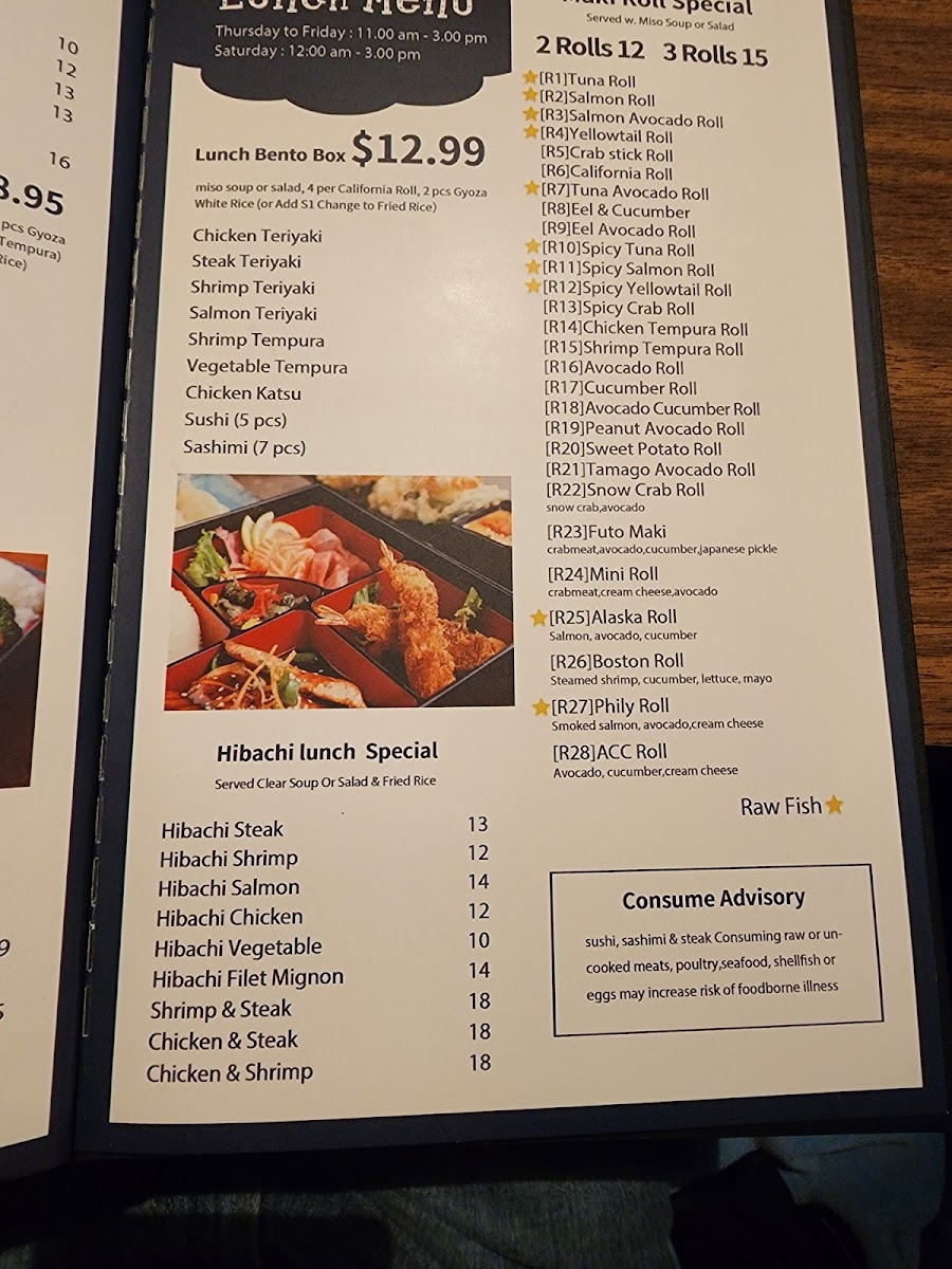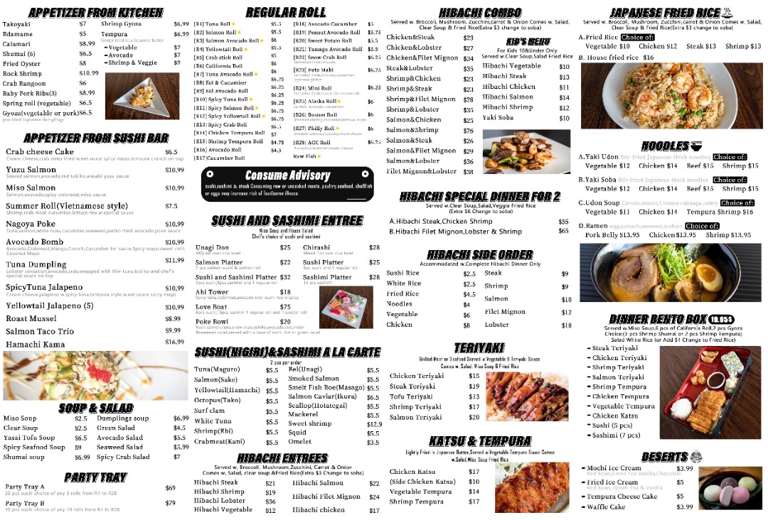 The menu boasts a tantalizing array of offerings that reflect the rich tapestry of Japanese cuisine. Start your meal with their famous Maki Roll Special, where you can indulge in any two rolls for just $11.50 or treat yourself to three rolls for $14.50. The sheer freshness of the ingredients shines through in each bite, with reviews praising the generous portions of fresh salmon and delightful eel rolls. If you're looking for something heartwarming, the Miso Soup and Spicy Seafood Soup are perfect starters to awaken your taste buds.